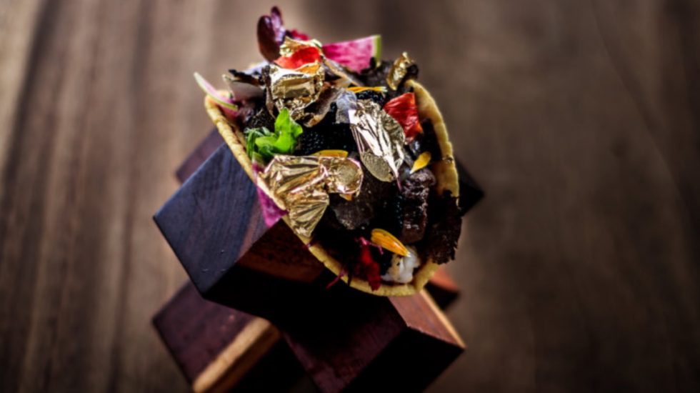 Y por si fuera poco, la salsa tenía chiles morita secos, tequila añejo ultra premium Ley.925 y café Kopi Luwak, obtenido de las heces de un animal en Asia. El taco se sirve en tortilla de maíz con infusión de hojuelas de oro.