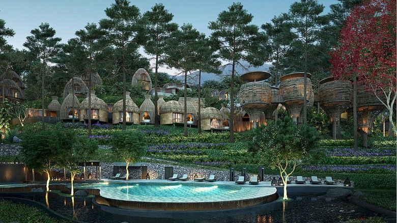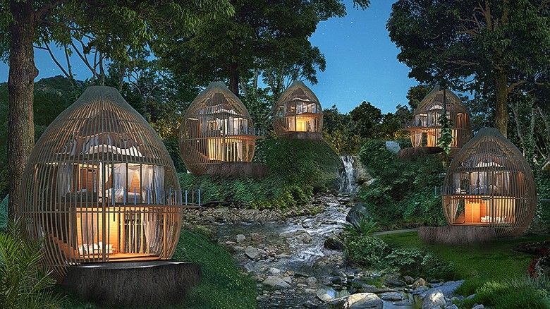 El concepto consiste en una construcción central con una recepción, restaurante y salón de eventos, así como habitaciones individuales donde los huéspedes pueden navegar lejos de la propiedad y quedarse donde quiera que deseen.