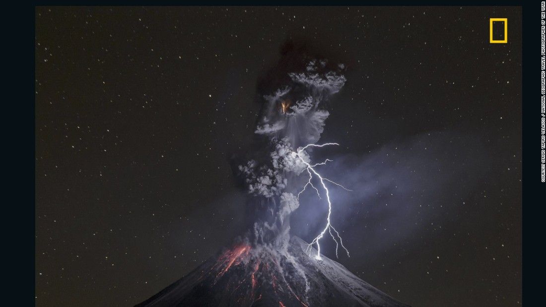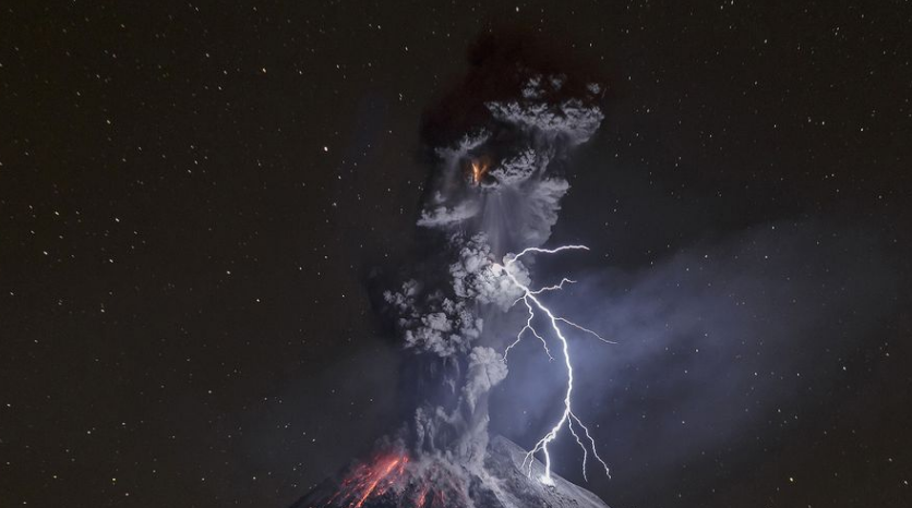 La imagen titulada “El poder de la naturaleza” muestra una erupción del Volcán de Fuego en Colima iluminada por un rayo que cayó de manera simultánea.