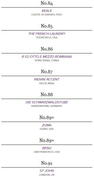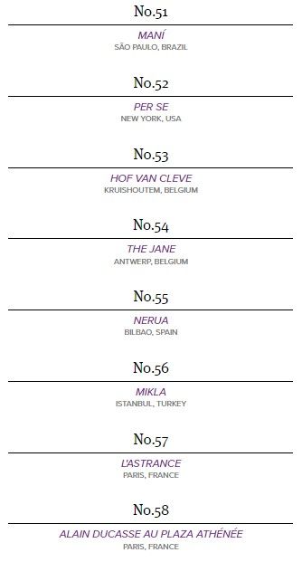 A continuación la lista completa de restaurantes entre el 51 y el 100. Los primeros 50 se darán a conocer la próxima semana, el 13 de junio.