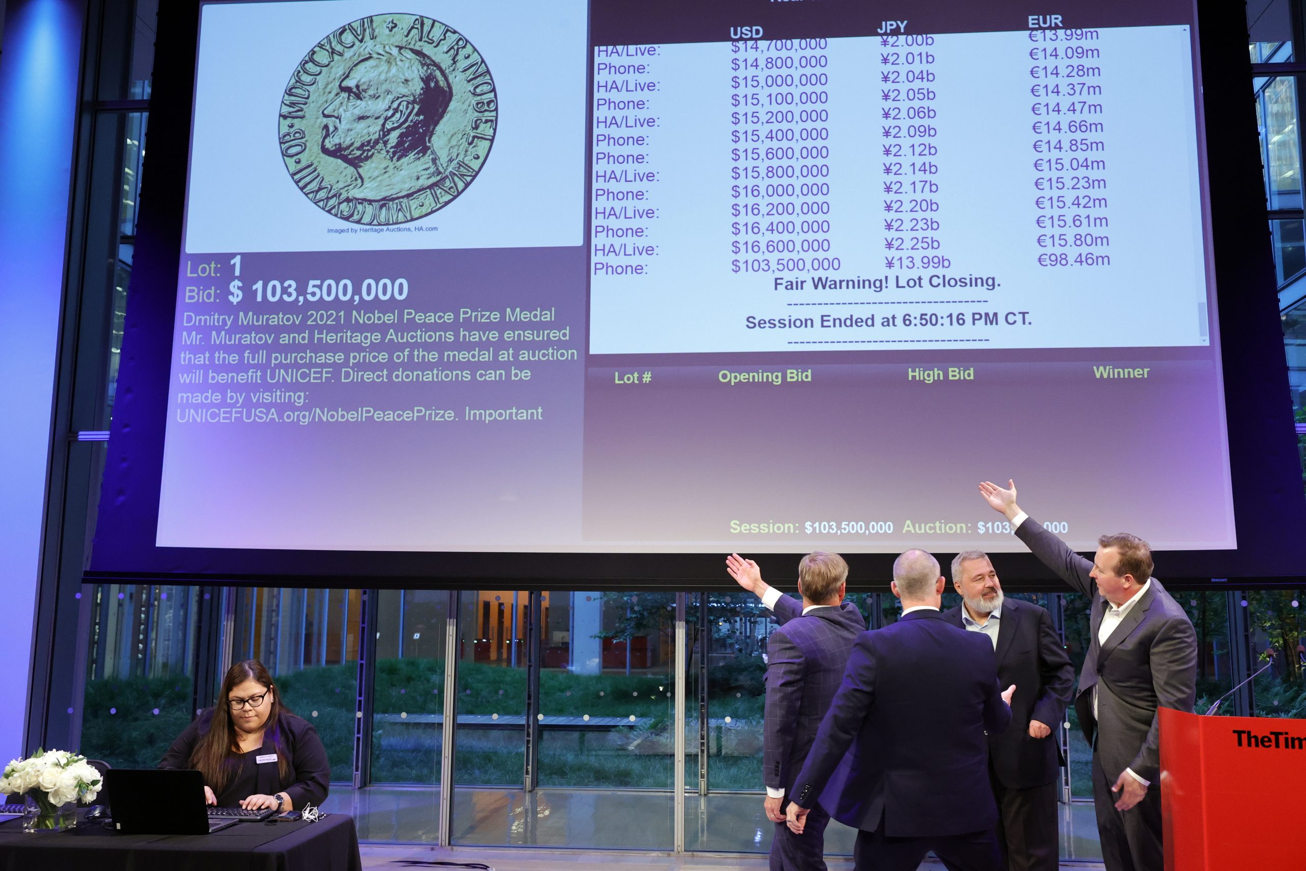 La medalla del último premio Nobel de la paz Dmitry Muratov fue vendida en Nueva York en una subasta y recaudó la cantidad récord de 103.5 millones de dólares, que irán íntegramente destinados a Unicef para ayudar a los niños ucranianos.