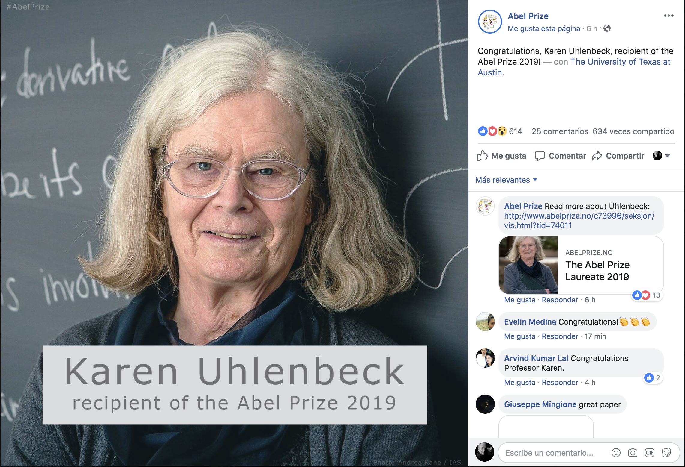 “Karen Uhlenbeck recibe el Premio Abel 2019 por su trabajo fundamental sobre análisis geométrico y teoría gauge, que ha transformado drásticamente el paisaje matemático”, dijo el presidente del comité Abel, Hans Munthe-Kaas, en un comunicado.