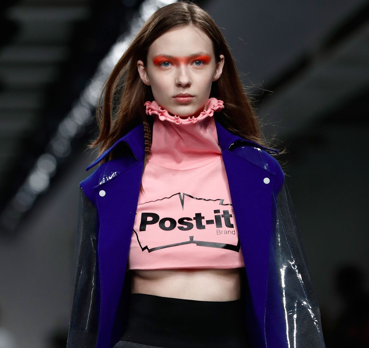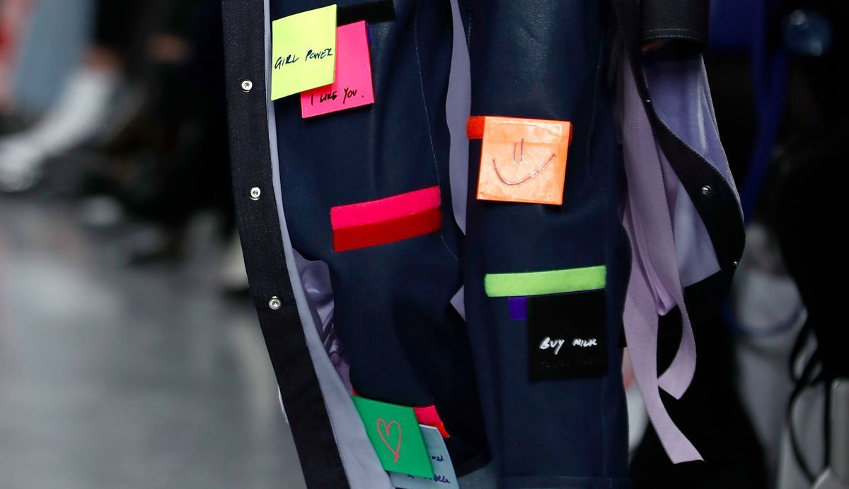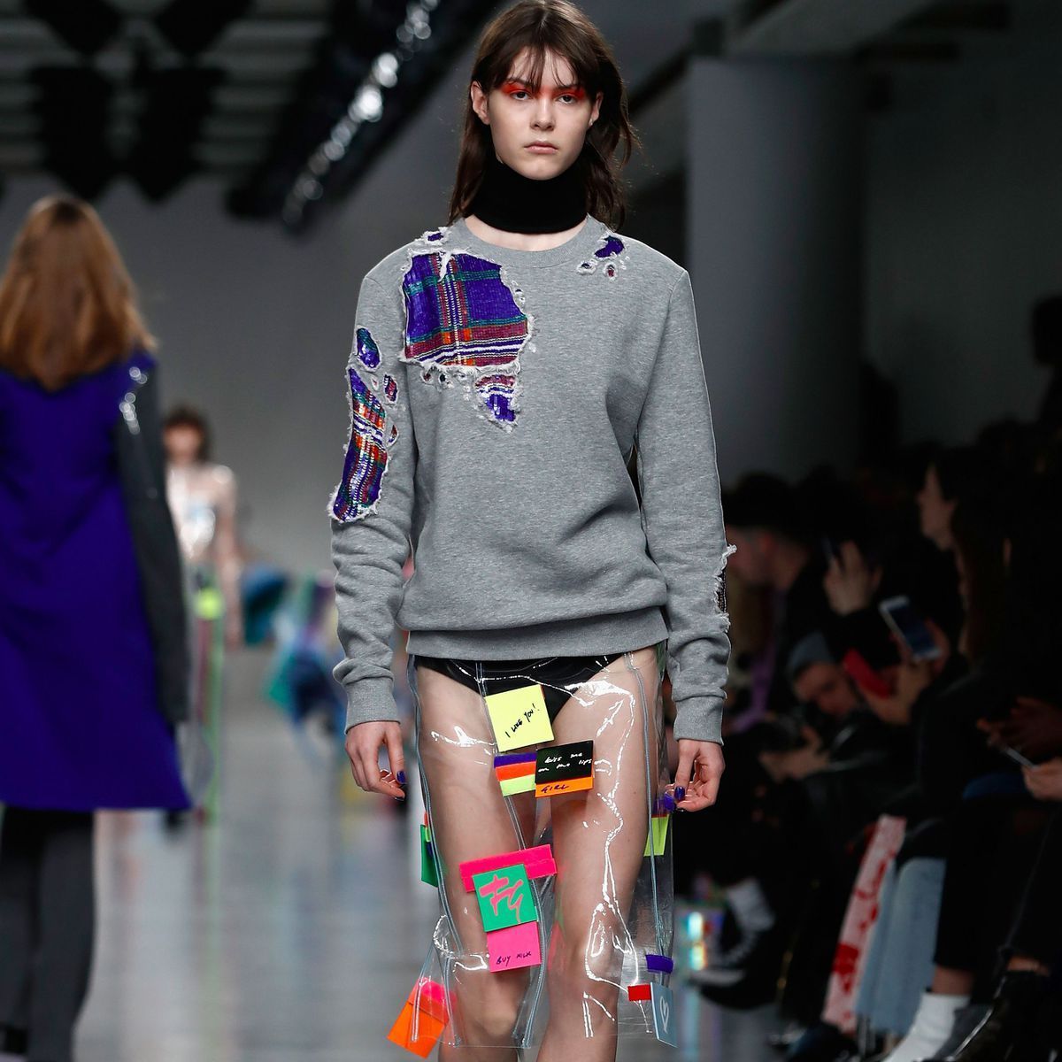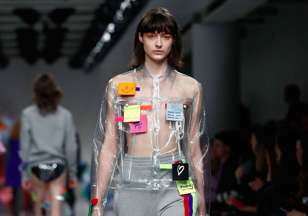 Las modelos en la pista del espectáculo de Fyodor Golan en la Semana de la Moda de Londres utilizaron faldas y blusas adornadas con notas adhesivas de neón con la inscripción “buy milk” (compra leche) y “I like you” (me gustas).