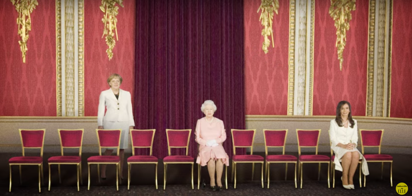 La Reina Isabel II, Angela Merkel y Cristina Fernández de Kirchner también aparecen en el clip donde se van desapareciendo el número prevalente de hombres, mientras que la presencia femenina resalta como mínima.